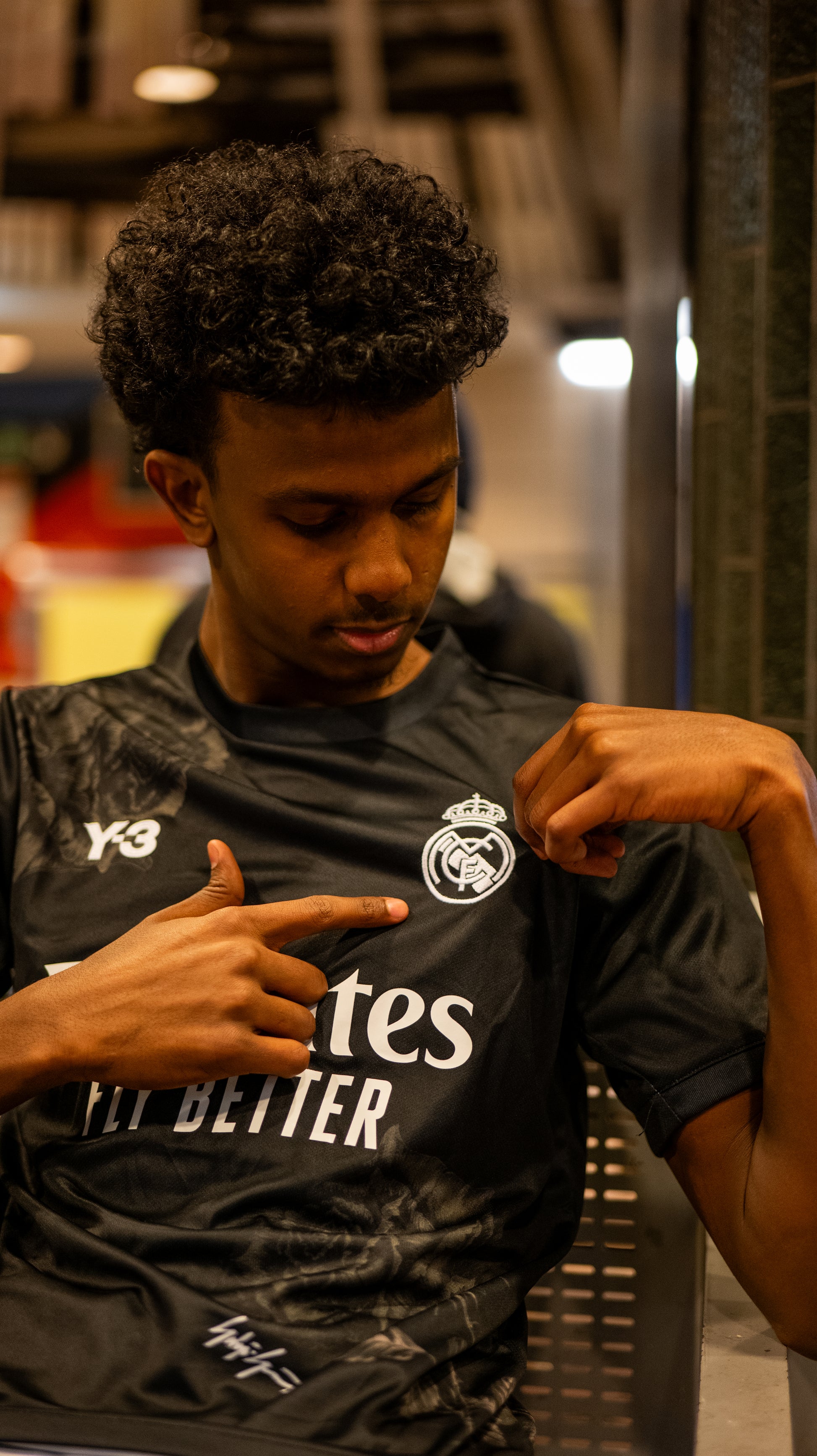 Exclusive Real Madrid Y-3 collaboration jersey in sleek black featuring stunning grey rose artwork. This limited edition design combines high fashion with football heritage, showcasing artistic floral graphics alongside the iconic Emirates sponsor and Real Madrid crest. A collector's piece that merges streetwear aesthetics with legendary club tradition.