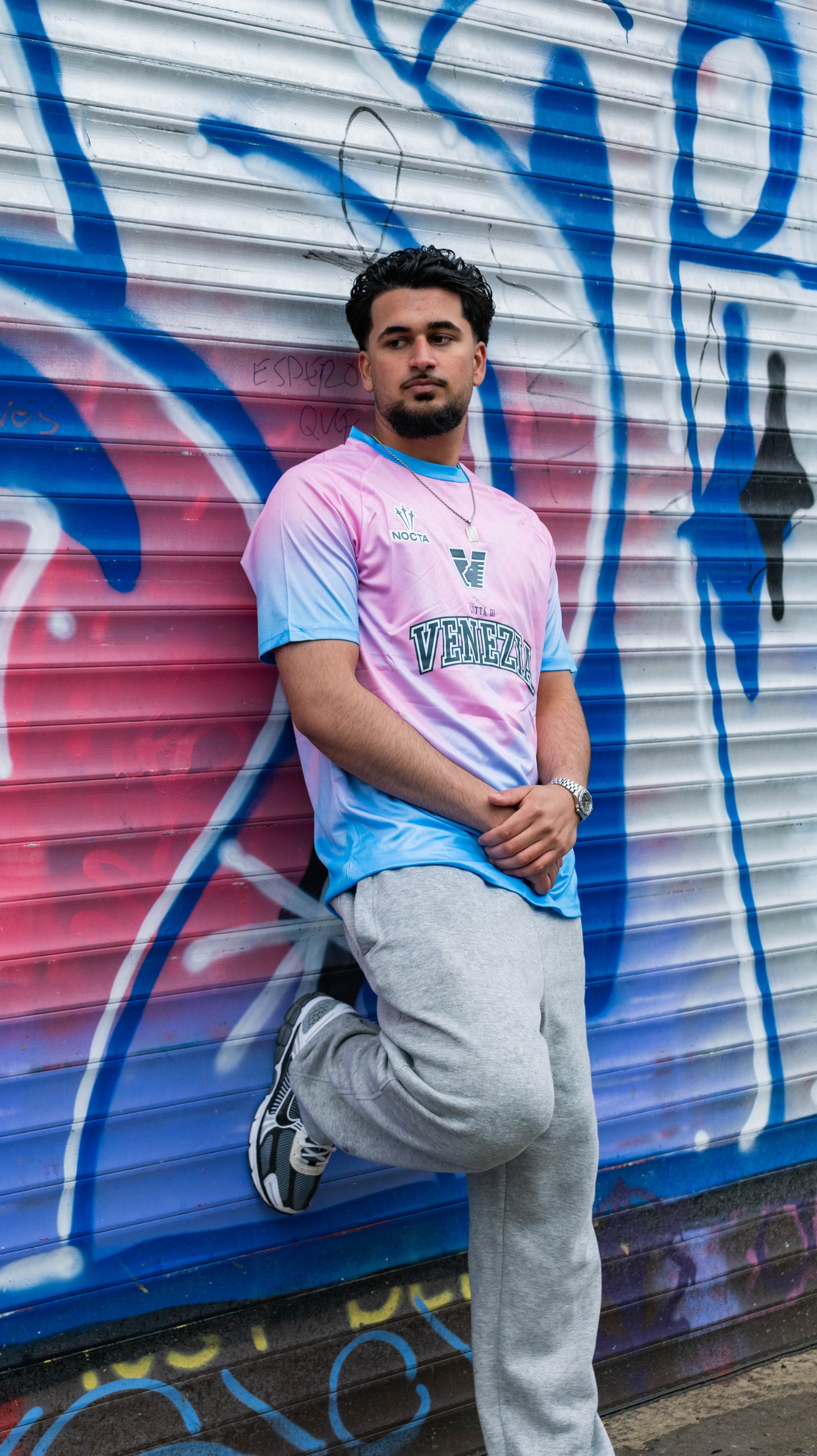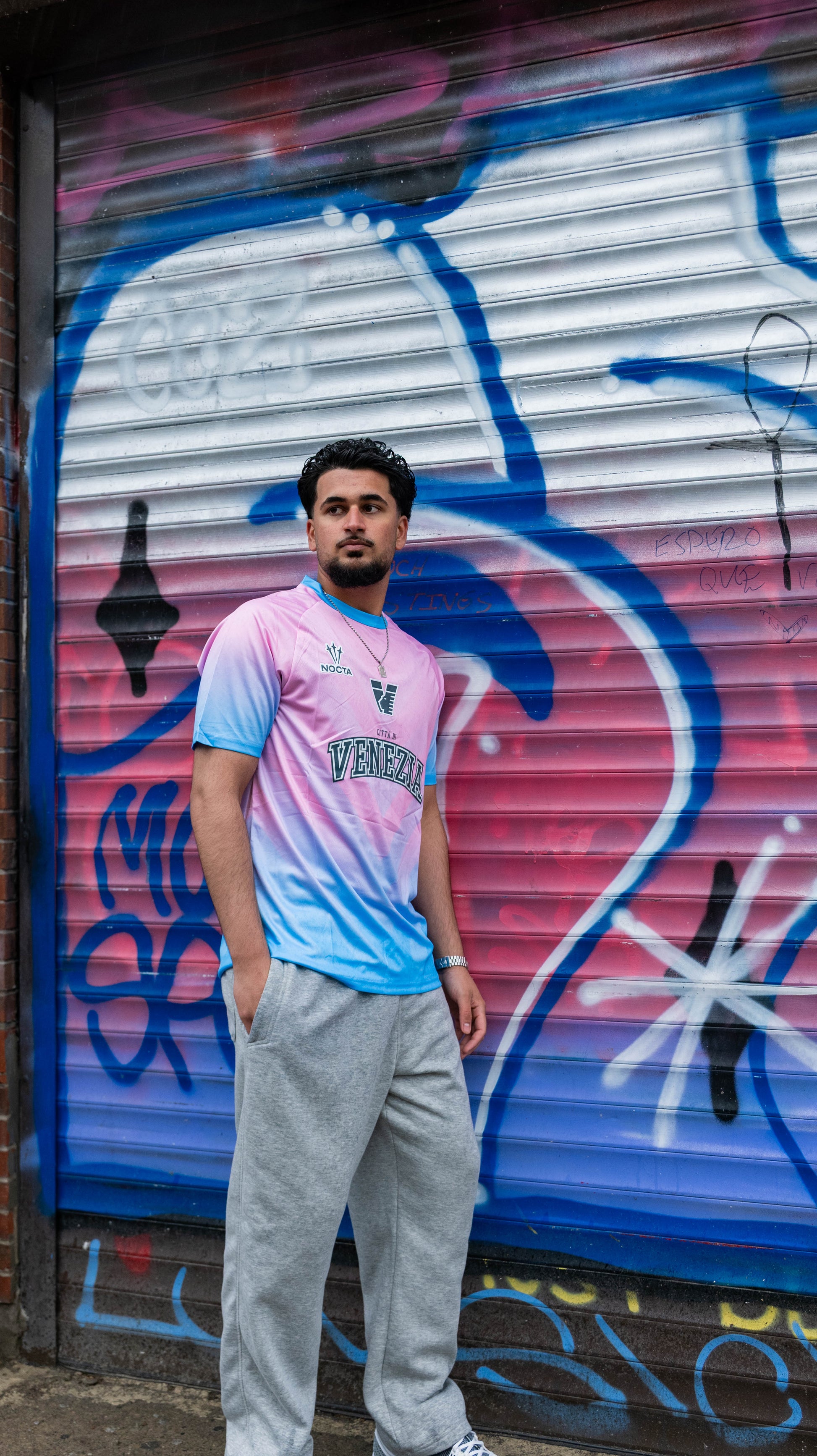 Stunning Venezia x Nocta collaboration jersey featuring a dreamy pink and light blue gradient tie-dye effect. This exclusive design merges Drake's Nocta brand with Venezia FC's unique Italian football heritage, creating a one-of-a-kind piece that celebrates both fashion and sport. The 'Città di Venezia' text across the chest honors the beautiful city of Venice. A must-have collector's item for fans who appreciate bold design and cultural crossovers.
